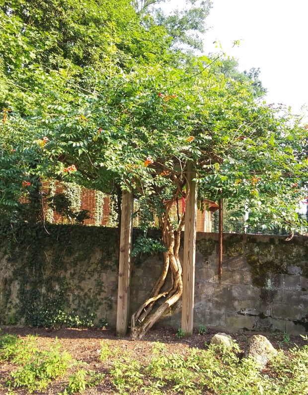 I have been wanting to write about Trees for Healing since I wrote the last entry about wells of water– and the fires, before that, for: there is always so much more. When I read, when I walk, when I look up at treetops, branches and leaves against sky, at the fireflies within arm’s reach, deer with new antlers, and look down at flowering weeds, growing plants, and running water over rocks, I have wanted to speak of, but have not had words. I did see– which annoyed it I think– a groundhog (Biblical rock badger-?) coming out from amid flat big rocks to the water, beside one under-street culvert, and in a friend’s yard by the little woods I saw and touched a little brown frog one morning, and a little toad that afternoon.
